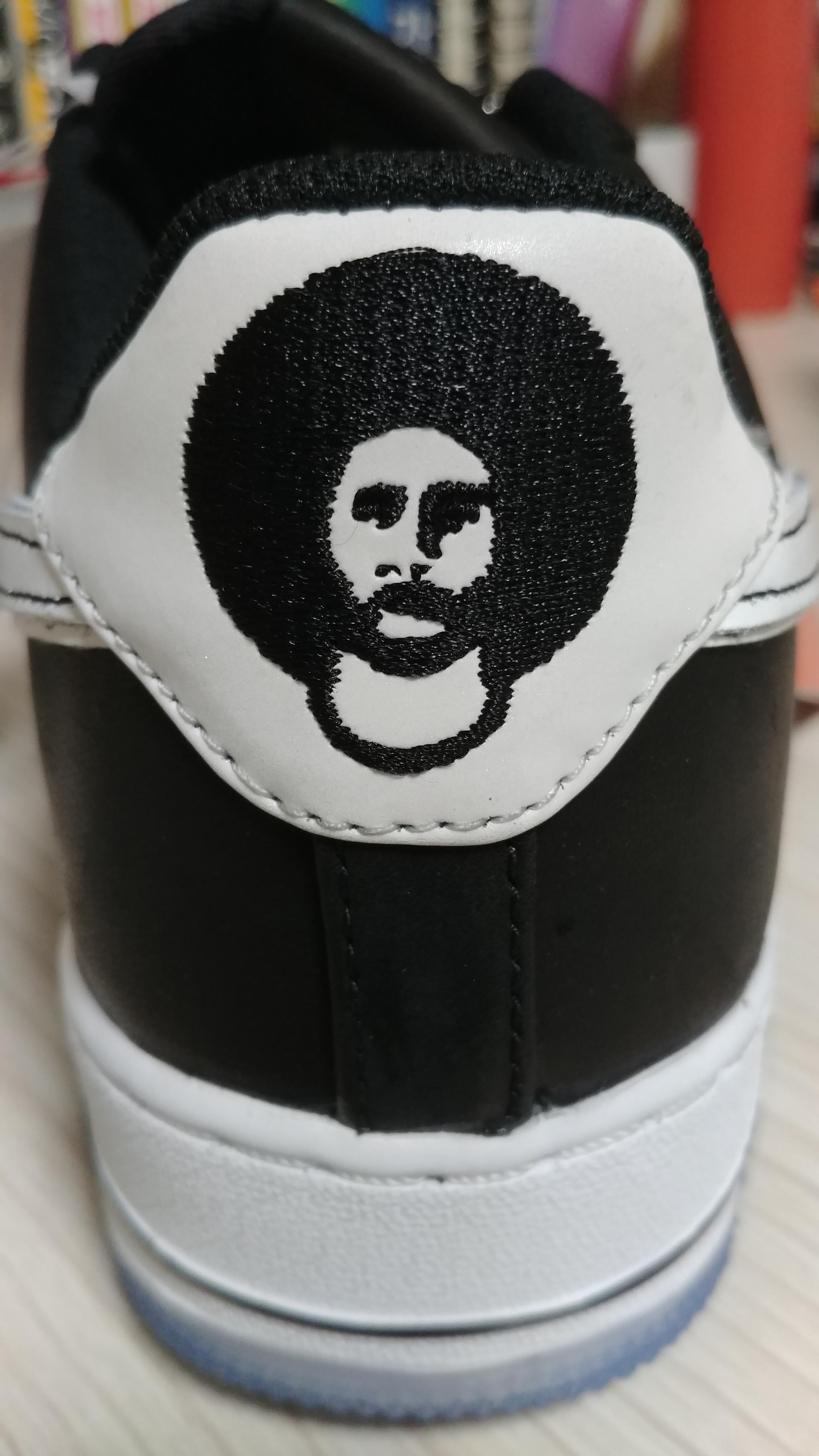 신발 뒤쪽에는 일반적인 나이키 마크가 박혀있는 다른 에어포스1 모델과 달리 콜린 캐퍼닉의 모습을 본딴 캐릭터가 자수되어 있습니다. 혹자는 밥 아저씨라고 부르더군요.