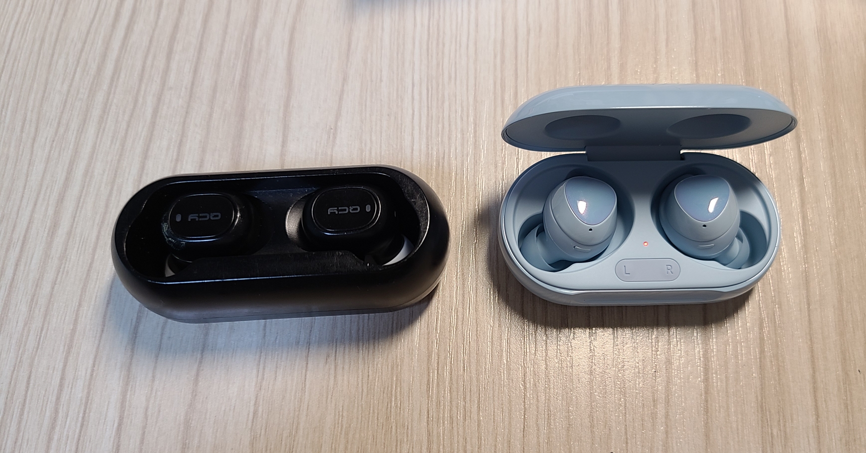 제가 기존에 사용하던 QCY T1과의 비교입니다. 세로 길이는 버즈쪽이 살짝 더 길고 가로 길이는 버즈쪽이 살짝 더 짧습니다. 다만 높이에서 버즈가 훨씬 낮기 때문에 기기의 부피감은 훨씬 덜한 느낌입니다만 QCY T1에 비해 무게감은 버즈 쪽이 더 무겁습니다.