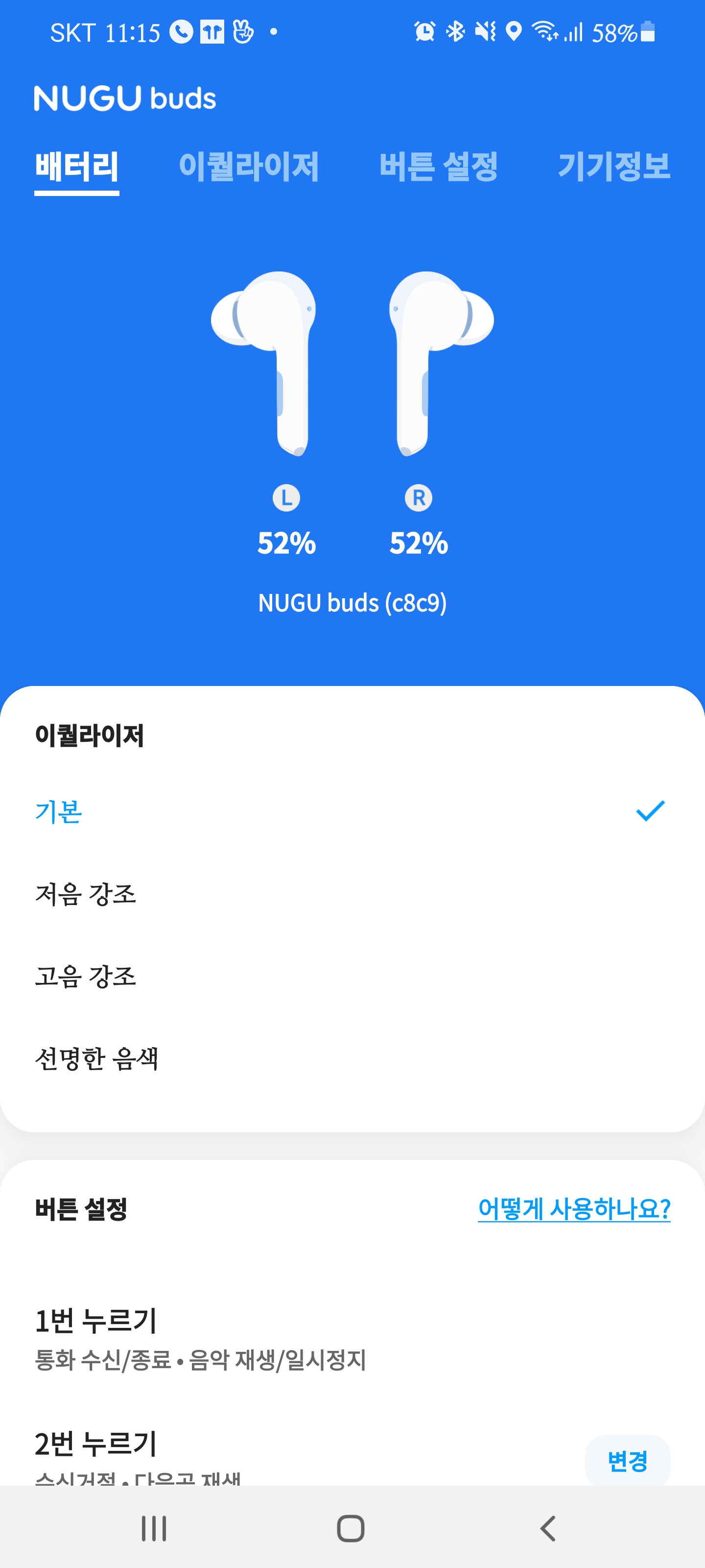 구글 플레이에서 누구 버즈 전용 앱을 다운 받아 사용이 가능합니다. 구성은 배터리 정보, 이퀄라이저와 버튼 작동 설정, 기기 정보 등입니다. 기존이 쓰던 톤프리나 전에 쓰던 갤럭시 시리즈와는 다르게 외부 소리 듣기 기능이나 노이즈 캔슬링, 잃어버린 이어버드 찾기 기능 등은 없습니다. 다만 기억할 것은 누구 버즈의 가격이 제가 기존에 쓰던 블루투스 이어폰의 3분의 1 혹은 4분의 1이라는 점입니다. 너무 많은 걸 바라선 안 되겠죠.