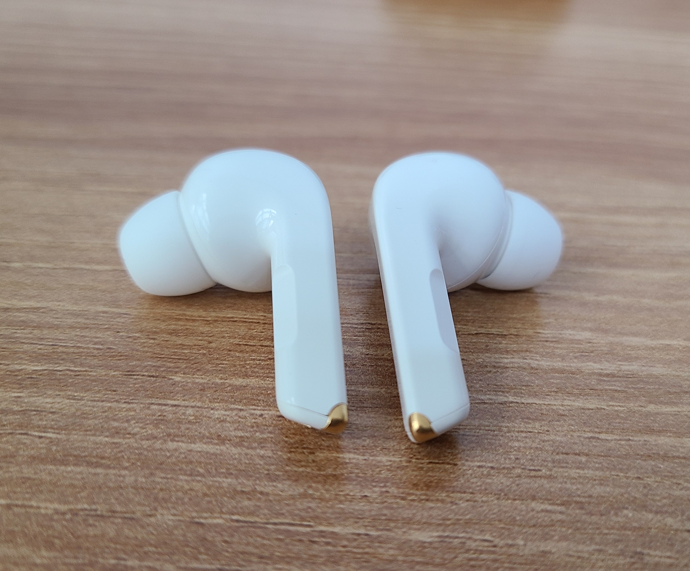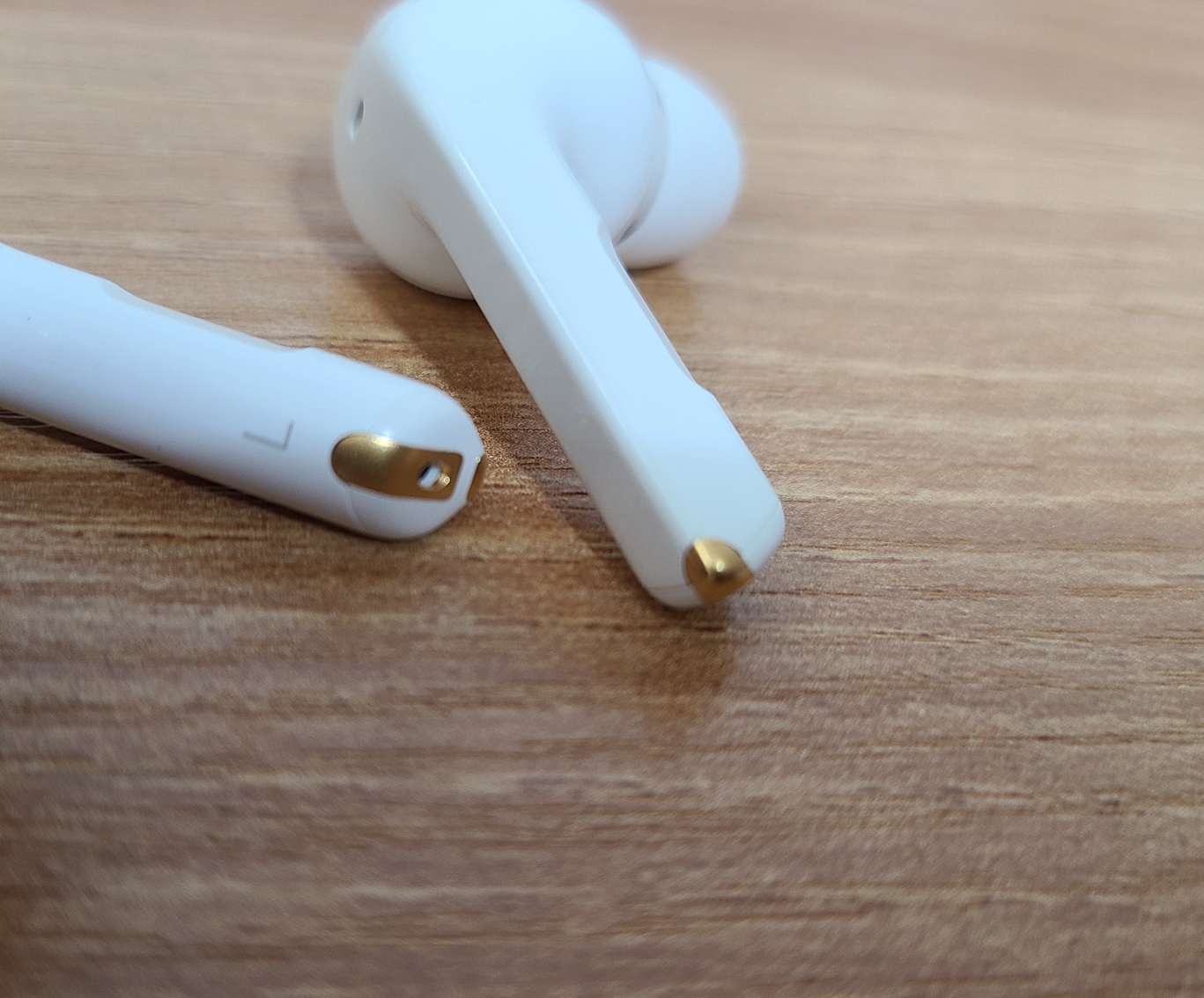 이어버즈입니다. 콩나물 형태이고 아래쪽 줄기(?) 부분에 감압 센서가 달려 있어서 저 부분을 터치함으로써 각종 기능을 활용할 수 있습니다. 충전 단자가 금색으로 살짝 눈에 도드라지는데, 디자인에 대한 취향 차이일 수 있겠지만 저는 살짝 아쉽습니다.