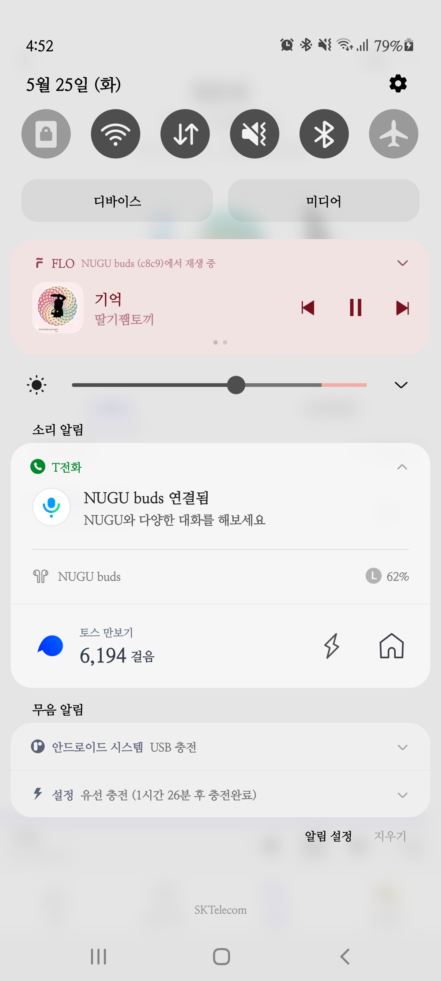 T전화 어플을 사용하는 경우 누구 버즈와 연결이 되면 저렇게 알림창이 뜹니다. 배터리 사용량을 푸쉬 알림을 통해 바로 확인 가능한 것은 편리한 기능 같습니다. 제가 가장 궁금했던 건 이어버드를 한 쪽만 끼고도 작동이 되느냐였습니다. 저희 어머니께서 주로 그렇게 많이 사용하시기 때문인데요, 각종 쇼핑몰이나 리뷰를 봐도 잘 안 나와있었습니다만 다행히 한 쪽 이어버드만 꺼내서 사용해도 연결이 잘 됐습니다.
